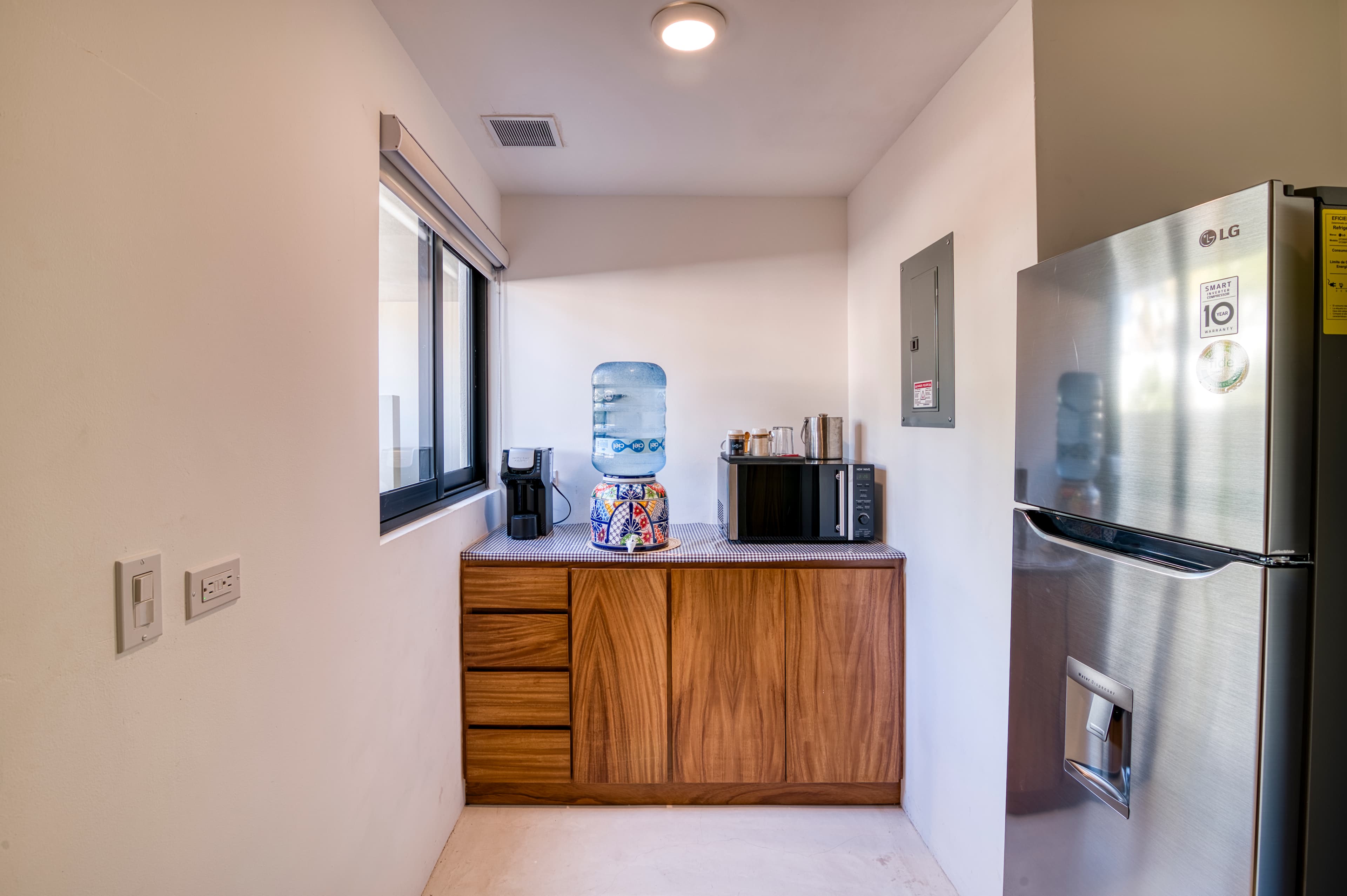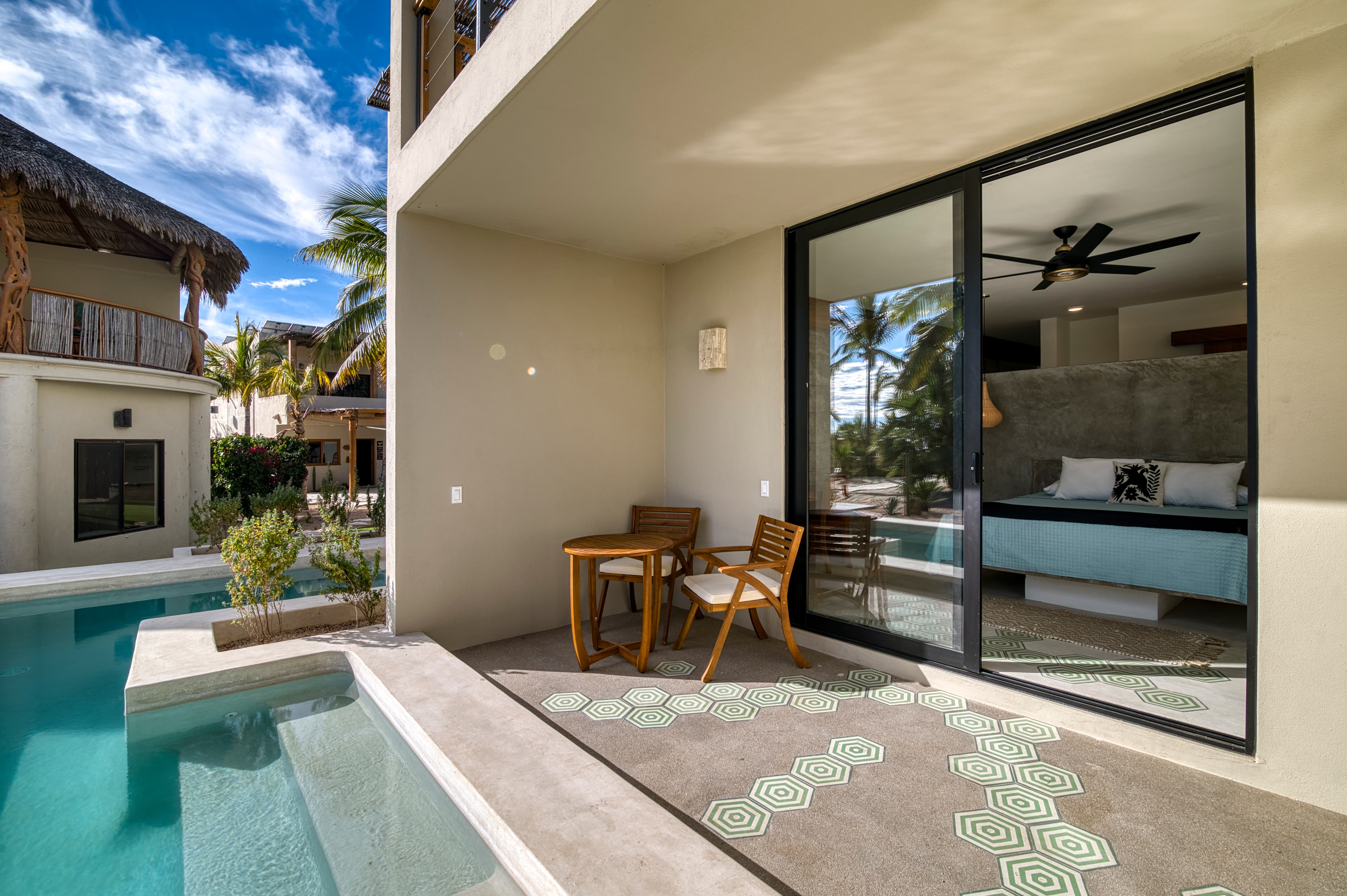 Deluxe 1 bedroom/ 1 bathroom ground floor unit. 1 king bed, and terrace fronting onto a small pool shared with Papache 1. Includes a kitchenette, refrigerator, microwave, coffee machine, room safe, and purified water dispenser. Maximum occupancy: 2 guests